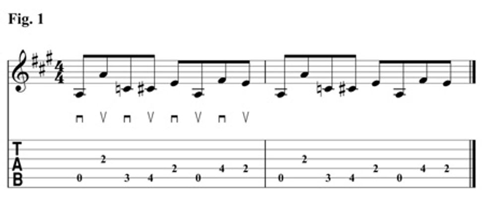 First, let's play the bass figure in the key of A in the open position shown in Fig. 1. Use the pick strokes written in the example and make sure to be consistent with them. It will make it easier when we combined this with the stabs in the next example.