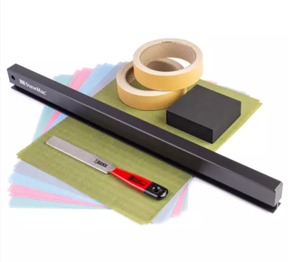Next up is a once-over with a fine fret edge tool that smooths out any tough angles on the ends of the fret wires, then a diamond file to round them out again after the leveling. Johnson rakes the frets—a sanding and polishing process with 400, 800, and 1000 grit sandpaper. Then it’s time to scrape the board back. With a razor blade, he scrapes away the wax and glue to get back to the soft Indian laurel wood underneath, then dusts off the gritty leftovers with steel wool. (Careful, though. Johnson says if your guitar has particularly large or precious inlays, it’s a good idea to take some extra precautions at the board-scraping stage.) A few drops of fretboard oil later, and the guitar is ready to rip. Thanks, Dave!