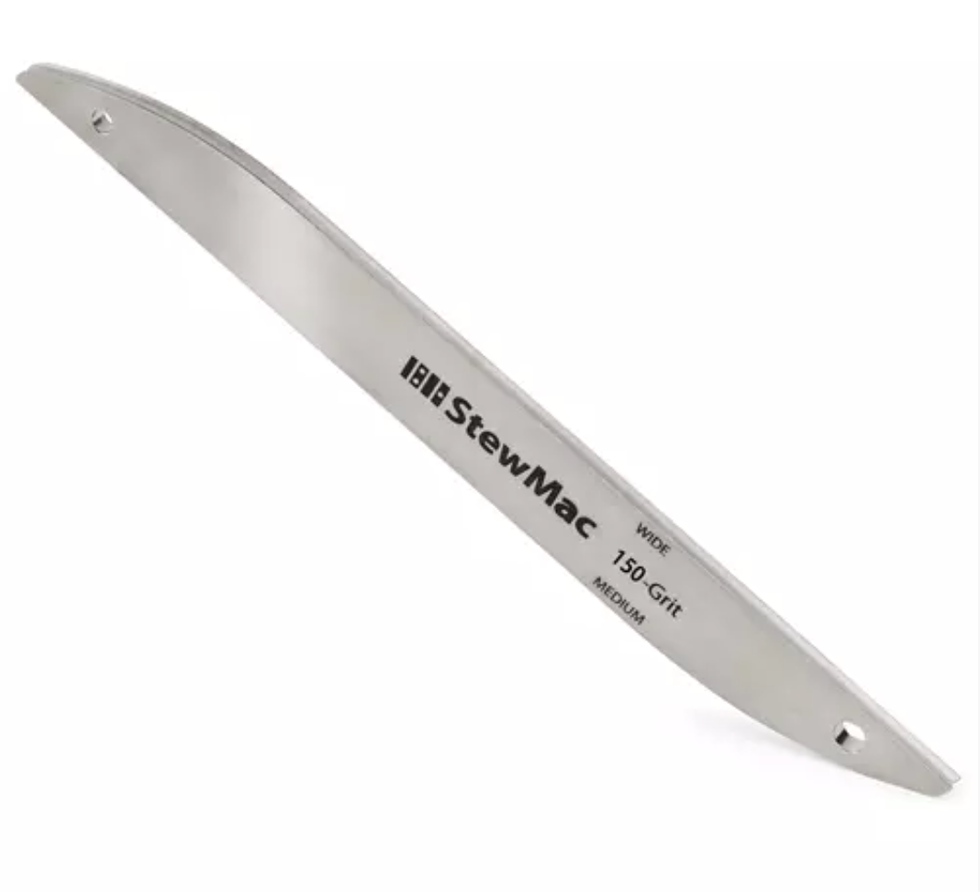Once the frets are solid, Johnson sets to work with a StewMac fret leveling bar (https://stewmac.sjv.io/Jr5By7) to bring the frets to a uniform height up and down the neck. The higher frets, however, will still be a little different, which Johnson explains with the concept of fall-away.