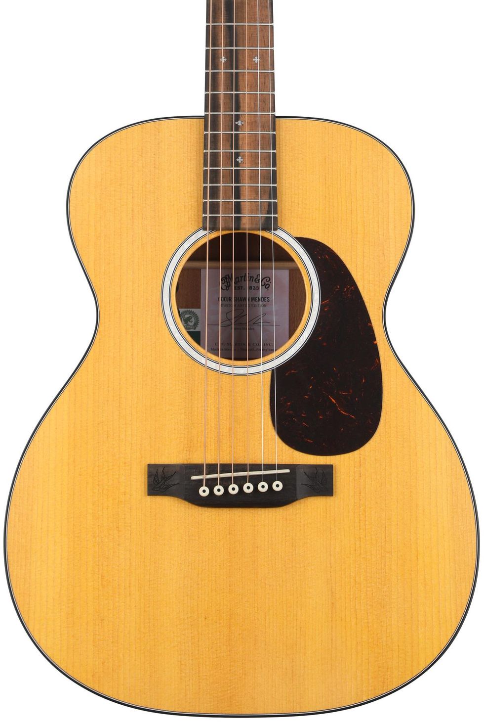 The Jr. size and 000-body depth are intended to make this guitar extremely comfortable for any player. And with Fishman Sonitone electronics included, it's designed to sound great on stage. A sample of Shawn’s lyrics is hidden somewhere inside the guitar. You might find one laser-etched on a brace, or under the bridge, or even under the rosette. Some of the phrases include: “We lay under the same stars,” or “You’ll never be alone.”