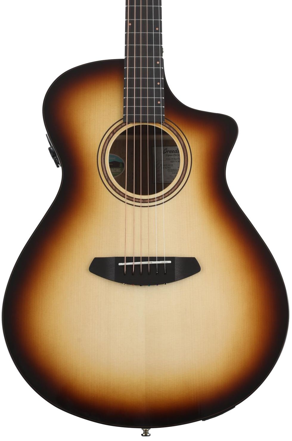 Myrtlewood grows in Oregon along a 90 mile stretch of the Pacific Ocean coast. It is Breedlove’s favorite tonewood for backs and sides. In addition to its highly varied color patterns extenuated by the thin Burnt Amber Burst finish, myrtle delivers surprising energy and extraordinary tonal balance. To further boost the high-energy sound, we chose a European maple neck—which is denser than mahogany—and an Ovangkol fretboard and bridge. Of course, the top is European spruce for responsive, powerful projection. We spared no detail, including brass inlays, Fishman Flex Plus-T Electronics, and a travel-ready hardshell case.