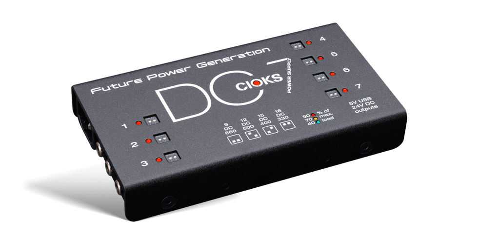 The groundbreaking DC7 has a one-inch (25,4mm) profile and weighs 1.1 pound (500 grams) thanks to the pure 2-stage switch-mode technology inside. The profile may be low but the power ratings are certainly not – the DC7 puts out a maximum of 48W and allows the user to connect multiple high-current effects such as devices from Effectrode, Line 6 and Eventide without noise of any kind.