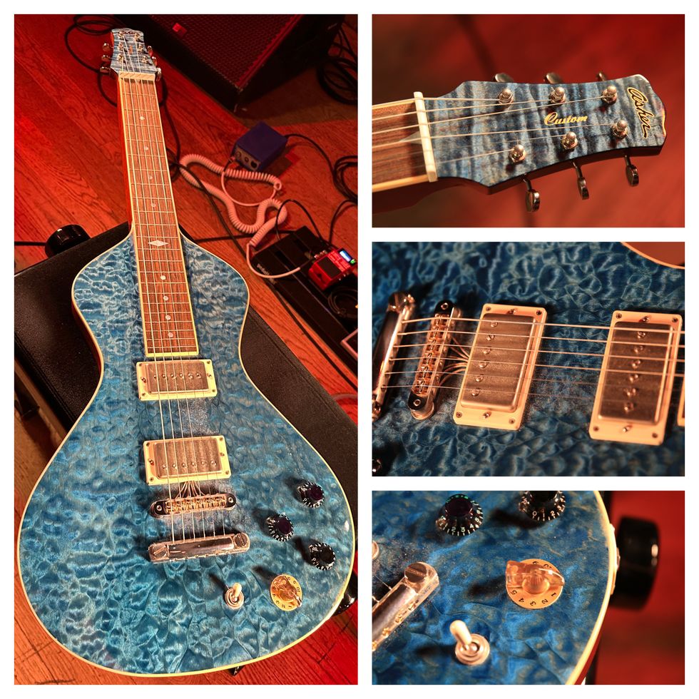 Ghent keeps it simple on this current solo tour. His number one is this 6-string Asher custom model lap steel built to 25" scale. The neck-through-body is African okoume wood, from the Congo, similar to mahogany but lighter. The top is quilted maple and the fretboard is rosewood. There’s a Lindy Fralin Pure PAF in the bridge, and a Fralin hum-free P90 in the neck position, hidden under a humbucker cover. There’s also a LR Baggs acoustic Tune-o-matic-style bridge, with acoustic pickups under the saddles. A Bartolini acoustic magnetic blend circuit combines with a chicken head control knob to blend the acoustic with the other pickups. Ghent uses Rocky Mountain Slides Company slides, and Dunlop finger and thumb picks. The coveted Asher is strung with Asher Electro Hawaiian Lap Steel Strings.