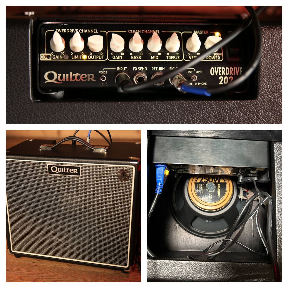 AJ runs his lap steel through his pedals then onto his AJ Ghent 12" Signature Edition Guitar Amplifier by Quilter Labs. The signature combo is stacked with a Celestion Copperback speaker.