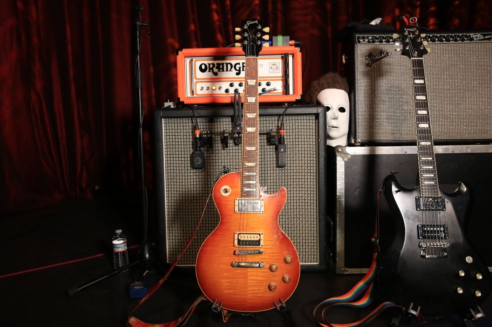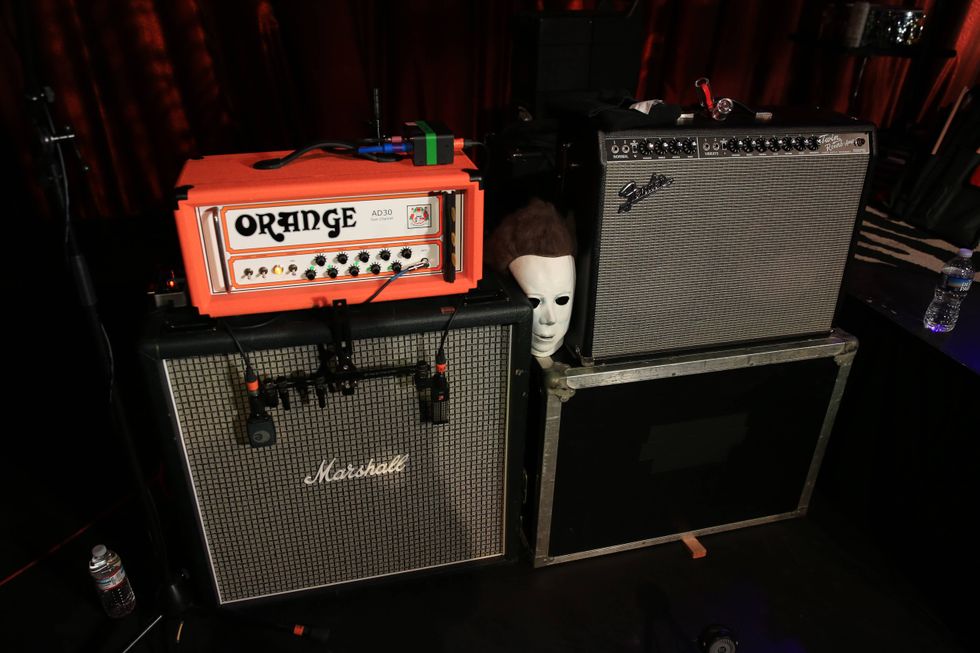 The Orange AD30 head is McLeod’s main amplifier, running into a Marshall 1960B cabinet loaded with Celestion Greenback speakers. The Fender Twin beside it is on hand as a backup.