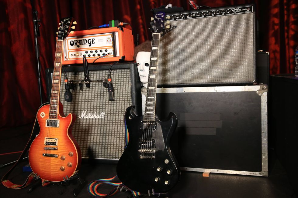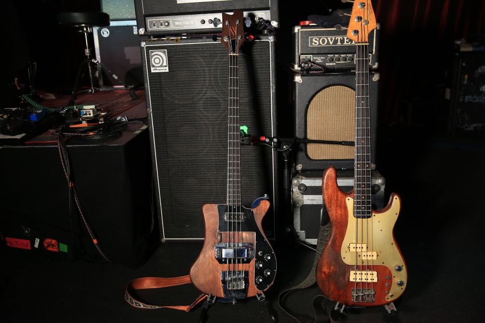 On the left, we have Parks’ number-one “Doom Broom”—a custom copy of a 1972 Rickenbacker 4001 bass—with its distinctive horns sheared, of course. The ’60s-era Fender Precision/Jazz hybrid beside it, which belonged to Parks’ dad, is a backup, and features unique out-of-phase switching.
