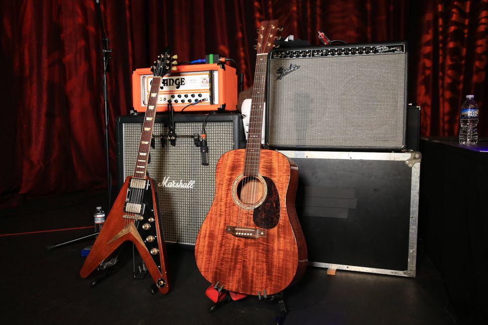 This Banker V-style is tuned to D standard for slide playing; McLeod’s slides wait atop his Fender Twin. The Martin acoustic beside it is used for collaborative live performances with tourmates King Buffalo.