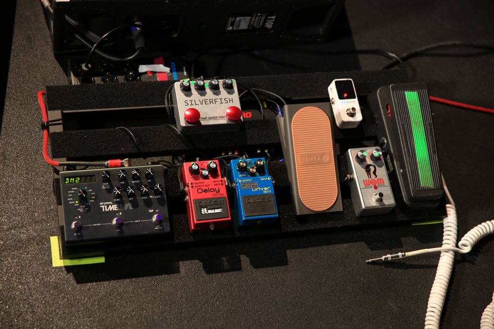 McLeod carries a Dunlop Cry Baby 95Q wah, TC Electronic PolyTune Mini, WEM CCB-1 Copicat Boost, Lehle Mono Volume S, Analog Man-modded Boss BD-2, Stomp Under Foot Silverfish, Boss DM-2W, and Strymon TimeLine.