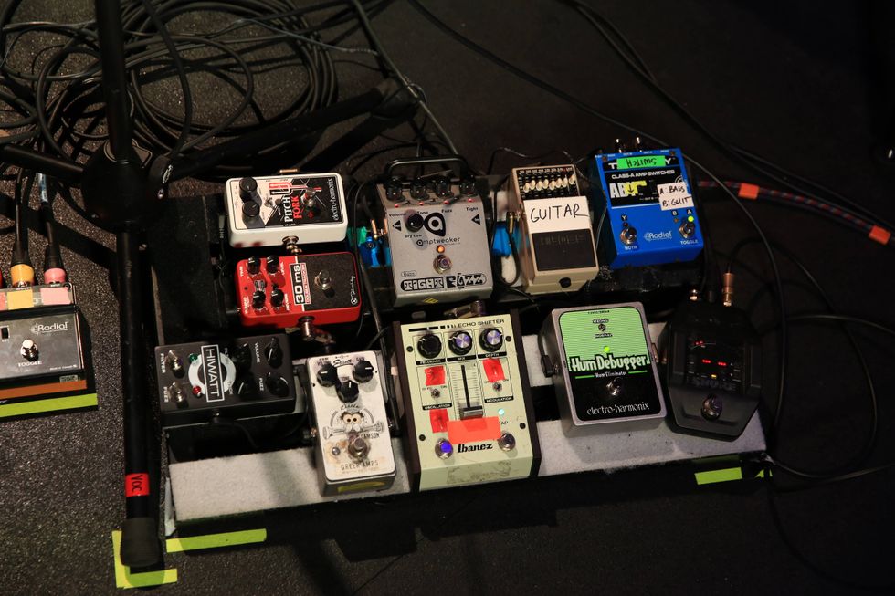 PArks runs a Shure GLXD16+ Guitar Pedal System, Radial ABY switcher for switching between bass and guitar, Boss EQ, Electro-Harmonix Hum Debugger, Ibanez Echo Shifter, Amptweaker Bass Tight Fuzz, Greer Little Samson, Keeley 30ms Double Tracker, Electro-Harmonix Pitchfork, and Hiwatt Fuzz.