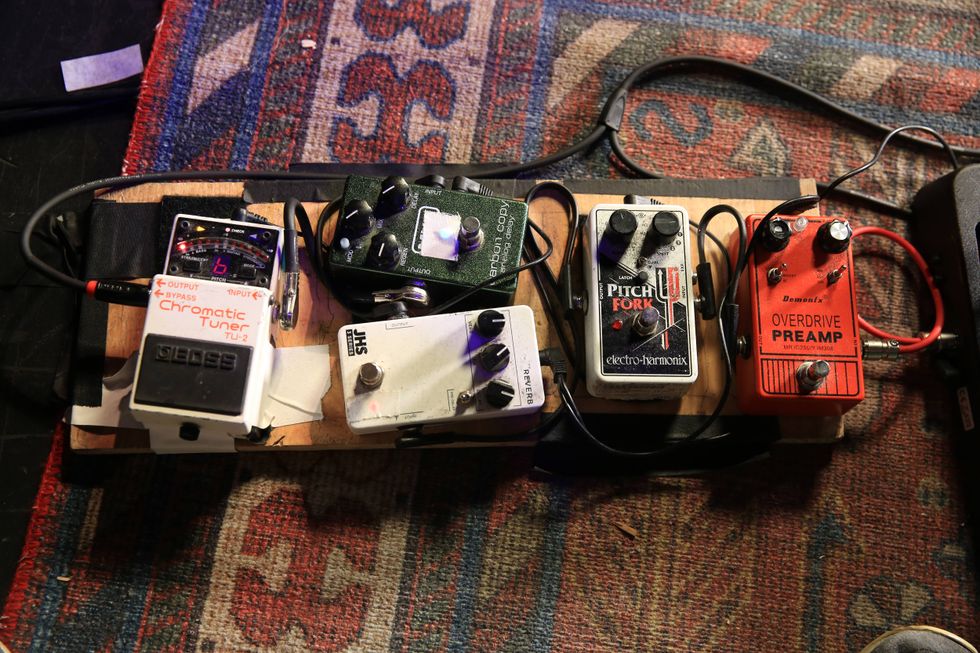 This Sovtek MiG 100 recently came out of retirement for this tour, and its smaller relative—the not-so-sensitively-named Sovtek Bassov Blues Midget—runs into a custom cabinet with a single 12" speaker. A Milkman The Amp is nearby in case of emergencies.
