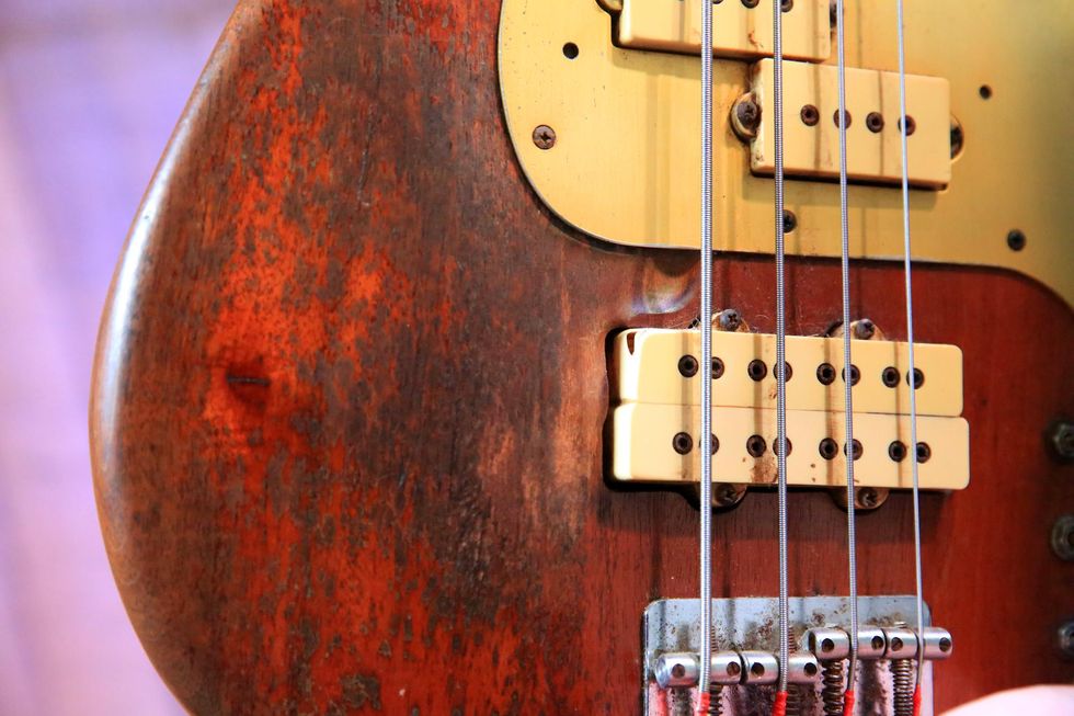 Since then, he had budding luthier and tech whiz Derek Ness build him a more dependable, road-worthy replica of the oddball (right). Besides the original’s brighter toaster pickups and its frayed look, the biggest difference is that the Ness Custom model has a Hipshot BT3 Bass Xtender detuner.