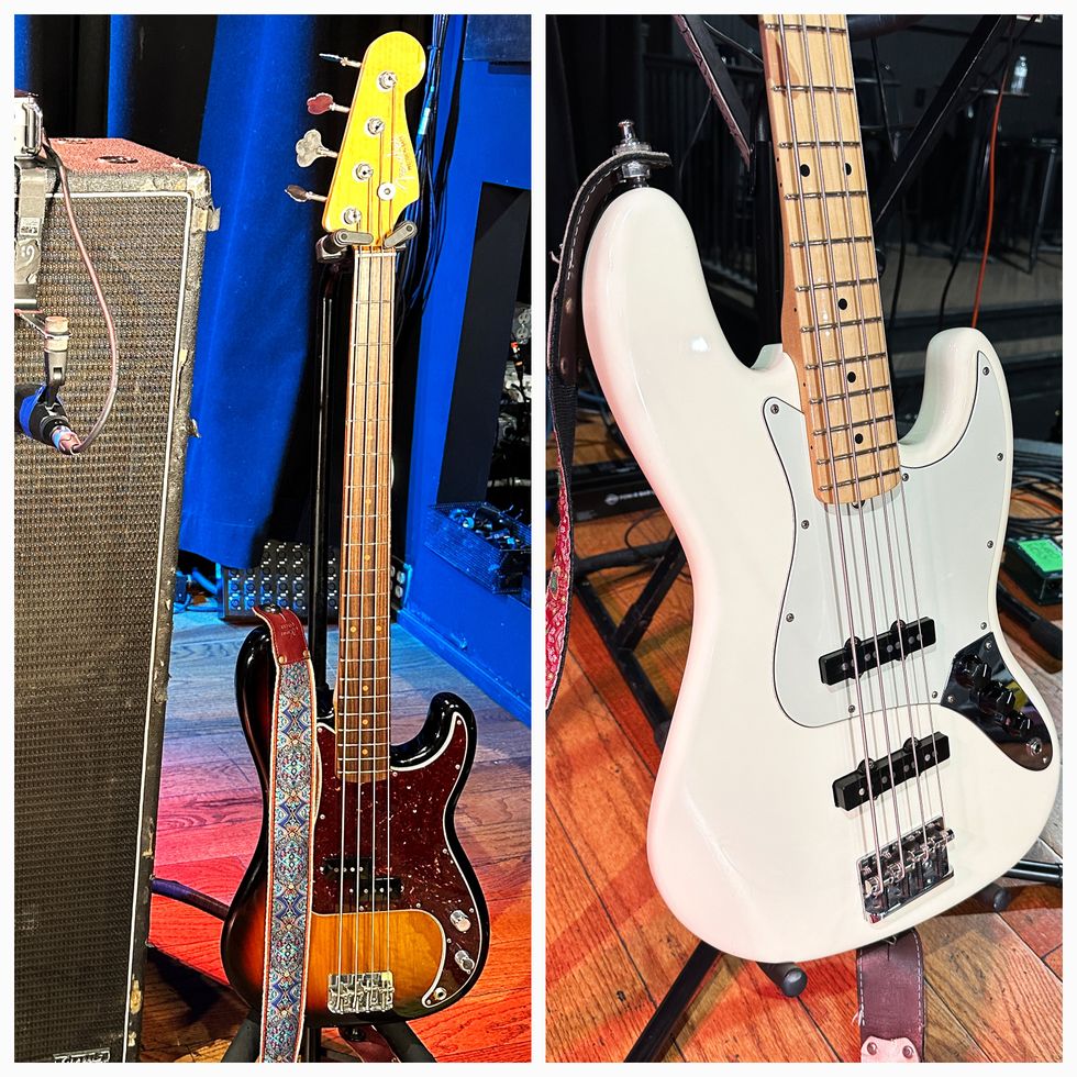 Bassist Nick Jost is a Fender man, too, with a Precision Bass and American Professional Jazz Bass that both run through his mini-but-mighty rig: A diminutive Gallien-Krueger Legacy series head powers a classic Ampeg 8x10 cabinet. He usually plays with his fingers, but when he loses a game of dice on the road, he’ll sometimes be forced into playing with a pick.