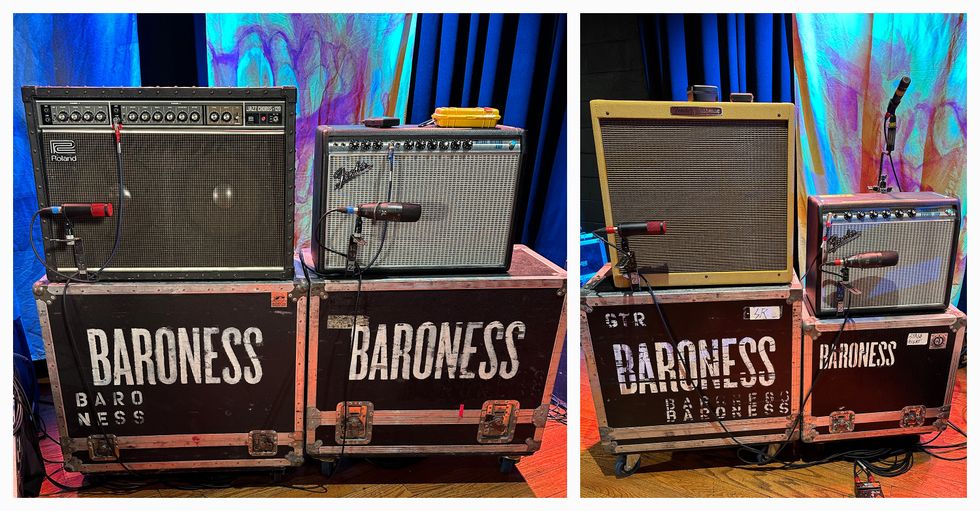 Baizley and Gleason both run stereo amp setups. Baizley changes his amp backline often; he used to run twin Roland JC-120s but just recently switched in this Fender ’68 Custom Deluxe Reverb.