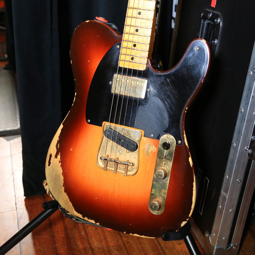 Black Pumas’ 2019 self-titled debut was like a drug—it soothed, it hypnotized, it recalled the past, it burned slow, and it was an addictive listen. It helped the band tally four Grammy nominations. But in addition to all that attention, it caught the collective ear of the Fender Custom Shop squad, who wore it out for months—so much so, that the team built the above Telecaster. Their aim was to create a guitar that nailed Quesada’s tones on the album, and they surprised the Texan with it. He’s been in love ever since, and mentioned that he’s collaborated on two other Teles—having some input on specs and design—but neither sound as stellar as this one. This one-off Tele is a pairing of a ’60s-style T (sunburst finish with a maple fretboard, standard-sized headstock, small pickguard, and barrel knobs), and a ’72 Telecaster Custom (single-coil-and-humbucker pickup configuration). Since acquiring it, this Tele has been Quesada’s main guitar onstage. He puts D’Addario EXL125 XLs (.009 –.046) on all his guitars, and uses Dunlop Tortex picks with custom printed Black Pumas graphics.