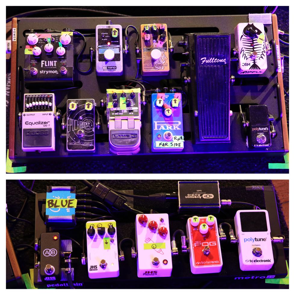 The other stomp stalwart has been the Electro-Harmonix Holy Grail that provides a healthy dose of spring reverb. Both ’verbs are engaged for drippy songs like “Fire.” He has a pair of delays: a Line 6 Echo Park used for its tap tempo function, and a Catalinbread Echorec for longer, dreamier repeats. The Boss GE-7 Equalizer works to match the different outputs between his three main instruments. A Catalinbread Belle Epoch preamp/buffer pedal replaced an Xotic EP Booster because it has a second knob for preamp for more detailed contouring.