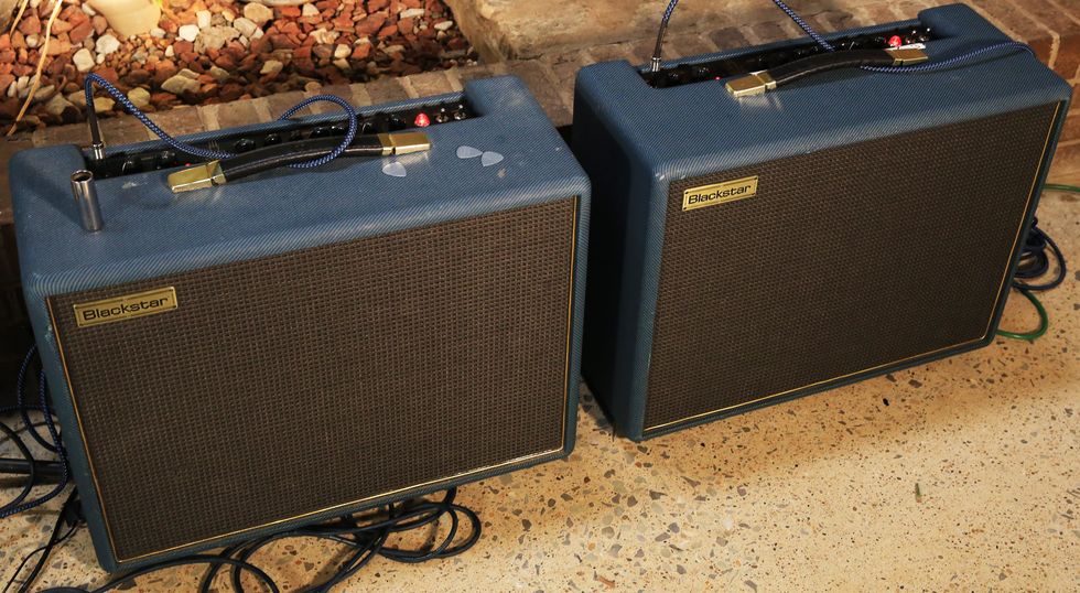 Vandenberg plays through a pair of her signature Blackstar CV30s, which she designed over a couple of years with the British amp makers. One of the combos is set to deliver more top end, and the other is set for low-end power. Together, they produce a full, hard-hitting sound.