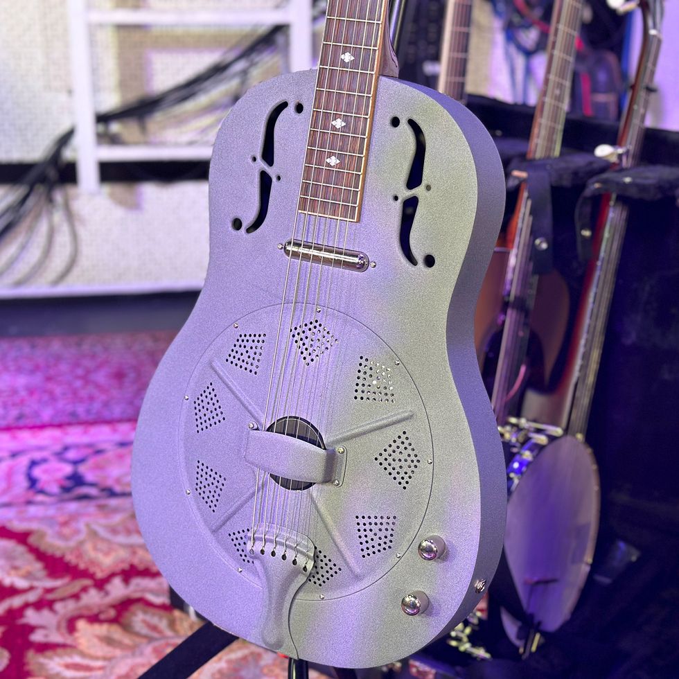 This Gold Tone GRS Paul Beard metal-body Resonator puts a brushed aluminum cone and biscuits inside an all-steel body with a 19-fret maple neck. With a stock lipstick pickup, Nichols uses it as one of his essential electrics. He prefers it to the more traditional thick resonator body, for ease of performance and weight relief.