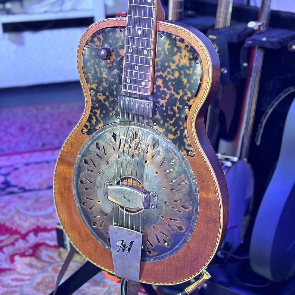 Nichols’ tunings include C#m, open F, and standard, tuned down a half-step. This guitar is a Mavis model, by Mule Resophonic Guitars—an open tuning classic. Dig that pickguard and the warm patina on the body. “It’s taken on a life of its own,” says Nichols. “Some people will show up at my gigs just to look at it.” The mini humbucker sounds sweet, with its basic volume control. The neck isn't too thick or too thin. "Kind of in the middle,” Nichols says. And it mostly gets played clean, or with a nice flavoring of delay.