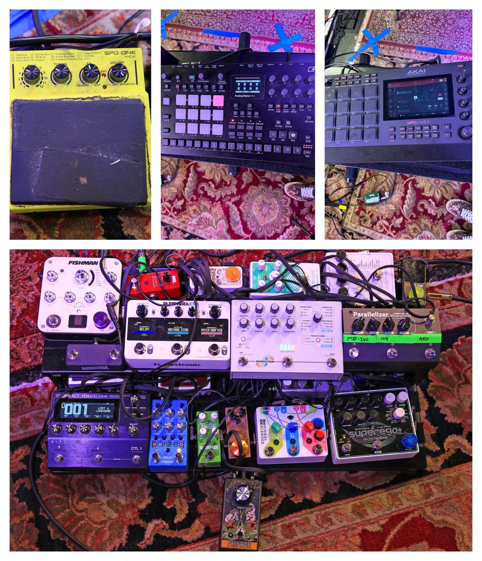But the “weird stuff,” as he puts it, starts with an Old Blood Noise Endeavors Signal Blender for switching between the acoustic, banjo, or amp. While the Fuzzlord can color everything, a cluster of his boxes are used to conjure pads and other ethereal sounds. These include the EHX Superego, a Fishman Aura, a Hologram Electronics Microcosm Granular Looper and Glitch Pedal (he calls it his red herring), an EHX Mel9 Tape Replay Machine, a TC Electronic Death Rax3, and a lot more. Listen while Nichols displays his entire array of delays in the Rundown. There’s an SPD-ONE Kick for stomping, and drum machines—an Akai Professional MPC Live II and an Elektron Analog Rytm MKII—too!