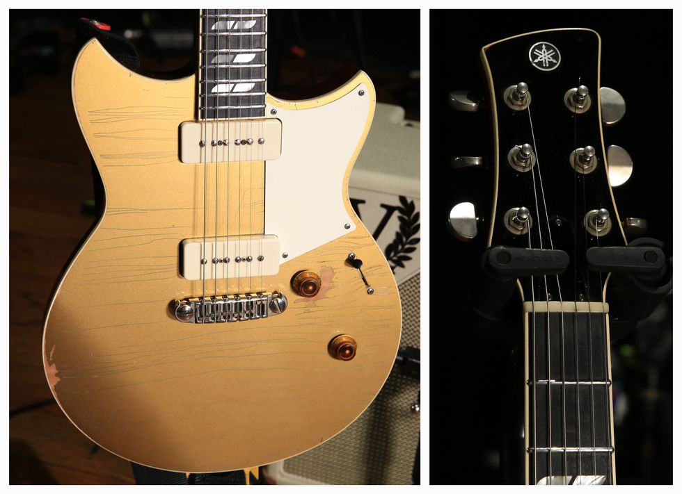 Buck’s trademark goldtop Yamaha Revstar is out for the rip, and he spared little space on his double-tiered pedalboard, but a special loaner Gibson and a modded Fender amp added some extra flair to the Nashville show.