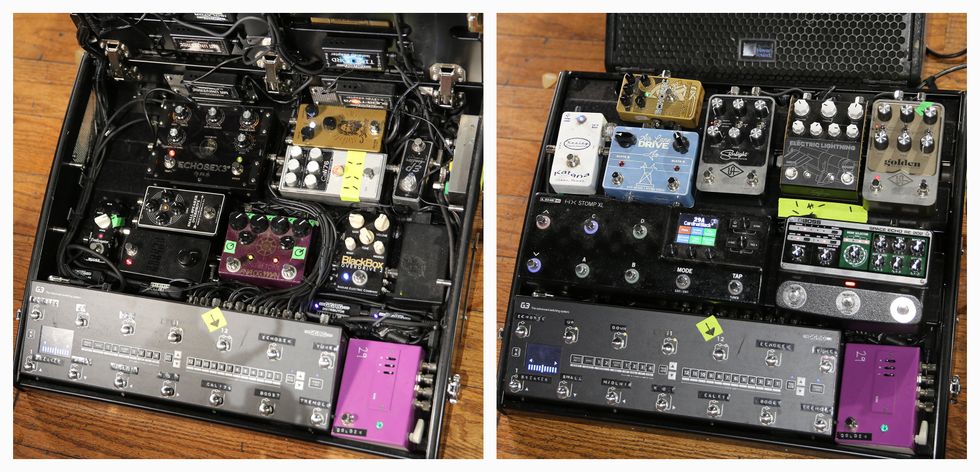 Then comes Buck’s modulation section, starting with a Mooer Trelicopter and a Catalinbread Echorec. A Line 6 HX Stomp XL handles some more delay and reverb sounds, plus some chorus. A Universal Audio Starlight Echo Station and Boss RE-202 Space Echo finish off the chain. A GigRig G3 helps Buck switch things up without breaking a sweat. Bucks rests it all on a pair of Schmidt Array pedalboards.