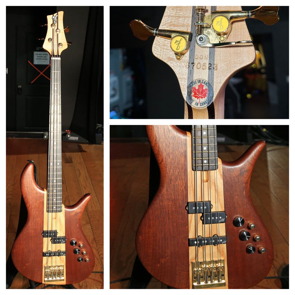 Benét has been a longtime fan of Steve Swallow. He recalled seeing the bass legend perform with an “F” bass and assumed it was Fodera. He later learned it stood for F Bass, founded by George Furlanetto in 1978. During a tour that was taking him from Toronto to Chicago, Donny B swung by F Bass HQ in Hamilton, Ontario, to check out their instruments. He left the shop without a new companion, but later connected with current owner Marcel Furlanetto and spec’d out this beauty that he stylized after “an ’80s high-end custom bass.” So, he had to have the two-tone body decked out with gold hardware (with a Hipshot D Tuner), a 5-piece neck with stringers, an ebony fretboard, Aguilar AG 4 P/J-HC set pickups, and a custom F Bass 9V preamp with bass, mid, and treble boost. Though the custom F has a P-J setup, Benét notes that during the U.S. tour he’s been playing it more as a P, and because of its versatile setup he can approximate many of the basses in his collection, depending on pickup selection and EQ. He claims that every note is even and it’s a FOH engineer’s dream to mix because it’s so clear and present. The F uses La Bella RX-S4D Rx Stainless Roundwound Bass strings (.045–.105).