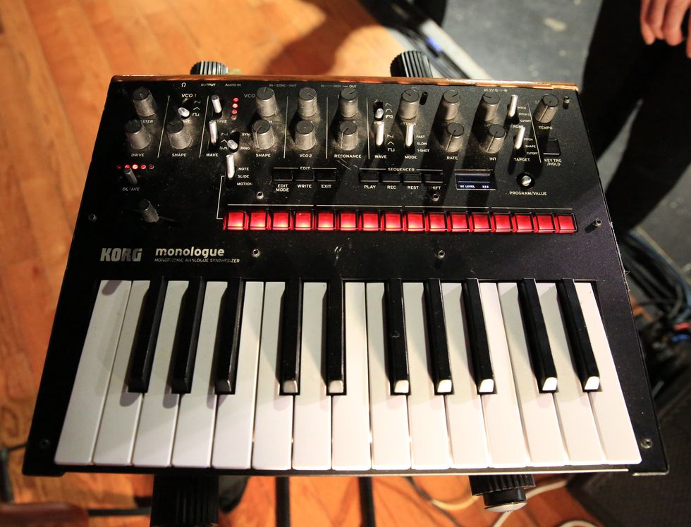 He’s toured with a Moog Little Phatty (bad idea) and records a lot with a Sequential Prophet-6, but for these spring shows he brought over the Korg Monologue analog synthesizer. He’s used them all over the world, and after each run he sings their praises for being durable, dependable, and damn cheap. The best part is that it fits in his carry-on case.