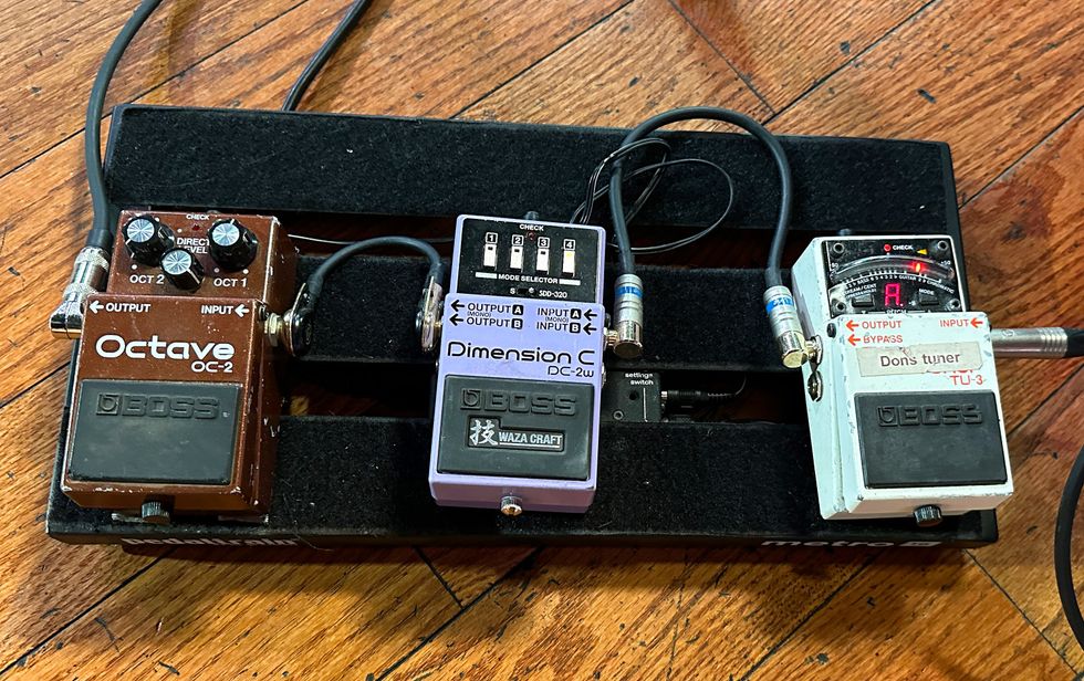 Most of Donny’s “effects” come from his VF4’s EQ and playing style or attack, but when he needs to intensify or widen his core bass sound, he’ll tap on either the Boss OC-2 Octave or the DC-2W Waza Craft Dimension C chorus. A Boss TU-3 Chromatic Tuner keeps his Furlanetto in check. And everything rides on a Pedaltrain Metro 16 board.