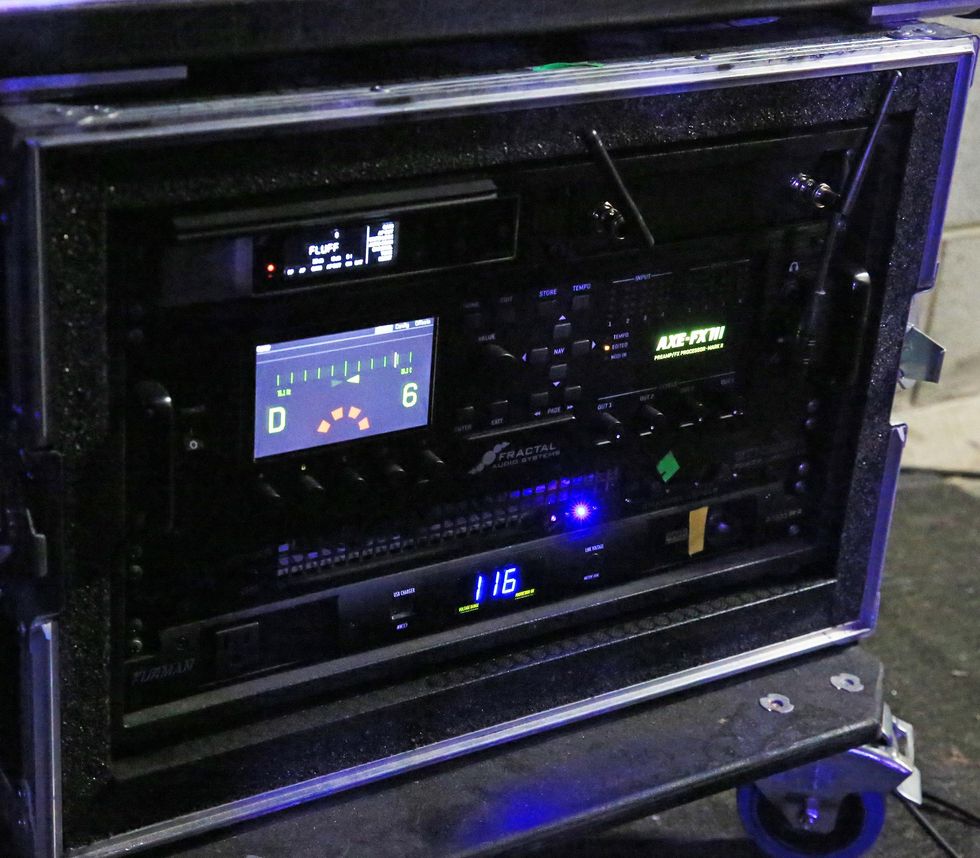 For years, Fluff and his bandmates relied on the accessible and reliable Line 6 Helix. After releasing their second album, Upright Animals, the band realized they have a lot more tonal requirements (pitch-shifting, acoustic guitar, octave, etc.), necessitating increased digital horsepower. So, they graduated to the Fractal Audio Axe-Fx III. Bruce’s core tone starts with a Marshall JVM setting and he creates colors from that platform. The Matrix Amplification GT1000FX-1U powers the Axe-Fx III. Fluff runs a wireless setup thanks to the Sennheiser EW IEM G4 unit.