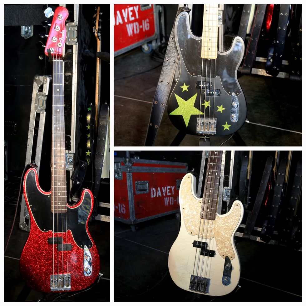Dirnt runs these mostly stock, with ash bodies, Fender HiMass bridges, either maple or rosewood fretboards, and Ernie Ball strings (.045–.105s), but some have small tweaks in the pickup department, with either custom vintage-style ’59 split single-coils or a Pure Vintage ’63 Precision pickup.