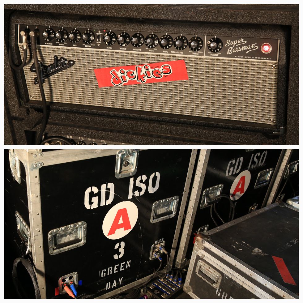 Dirnt runs his bass into this custom-design Fender Super Bassman, an amp he developed with Fender based on a mix of amps, preamps, and DI units he loved. The Super Bassman runs into a 4x10 in an onstage isolation cabinet, front of house, and Dirnt’s in-ears.
