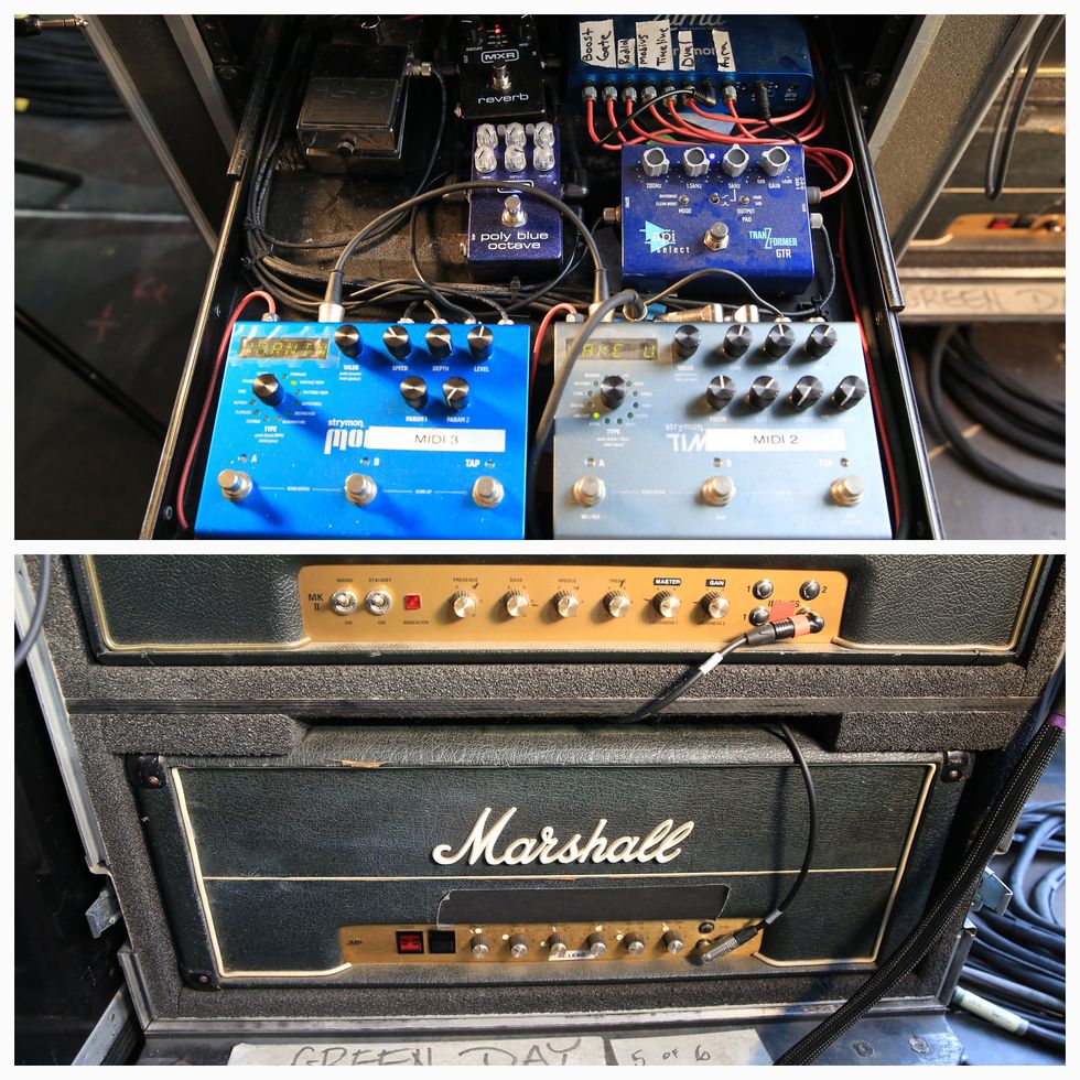 True to Green Day style, White rocks with two Marshall heads. The first one is a ’90s reissue JMP 1959SLP MKII with the famed Dookie mod. It handles cleaner, more midrange-focused sounds. The bottom box, a late ’70s 100-watt JMP Super Lead with SE mod, gets more gain-y. They both run into 4x12 cabs in isolation boxes on stage, so like the rest of the band, White works just with in-ears.