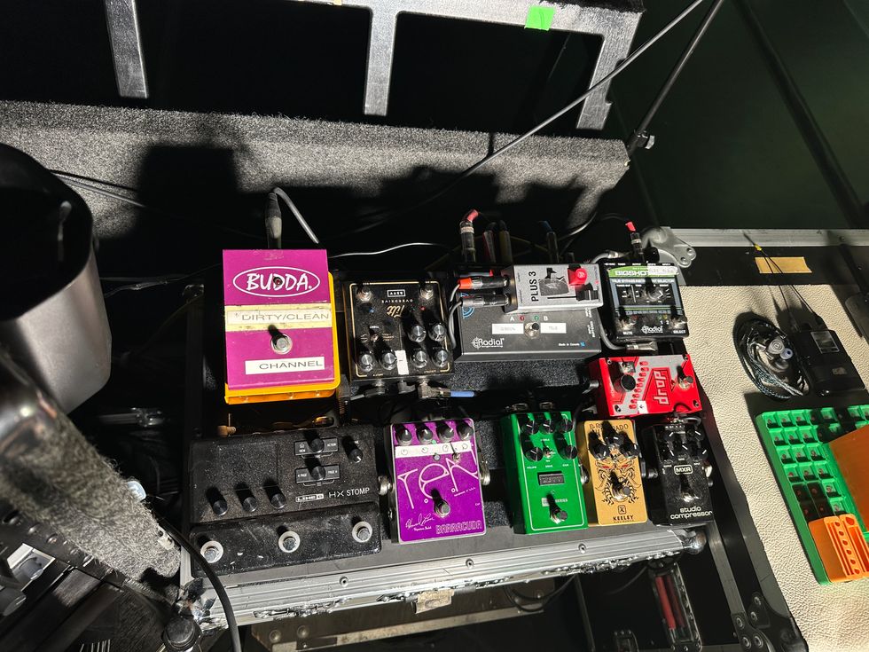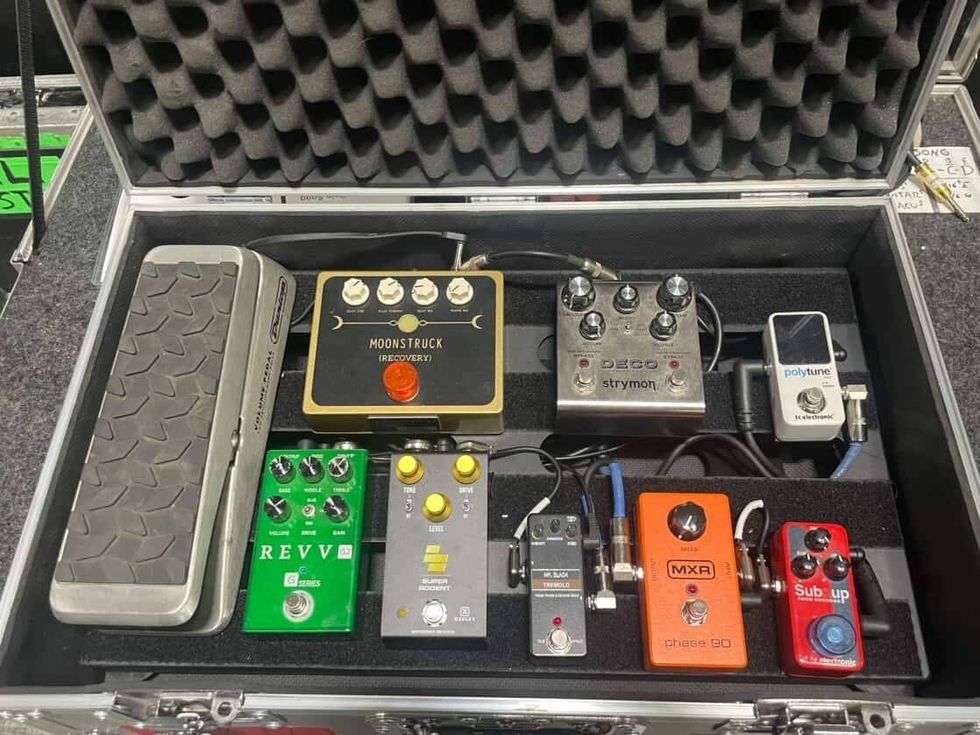 Waters’ board includes a TC Electric PolyTune Mini, TC Electronic Sub ‘N’ Up, MXR Phase 90, Mr. Black Tremolo, Keeley Super Rodent, Revv G2, Strymon Deco, Recovery Effects Moonstruck, and a Dunlop Volume Pedal.