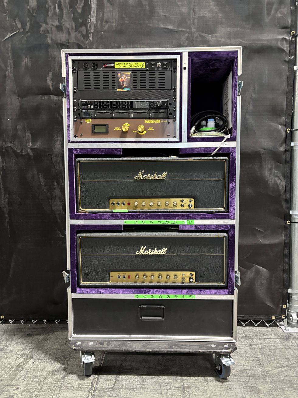 Wariner’s top dog is his 1973 100-watt Marshall head, modded by Dave Friedman. Another 1970 Marshall JMP head with the same mod is on deck as a spare. The heads run through a Friedman cab with a mix of Celestion Greenbacks and Vintage 30s.