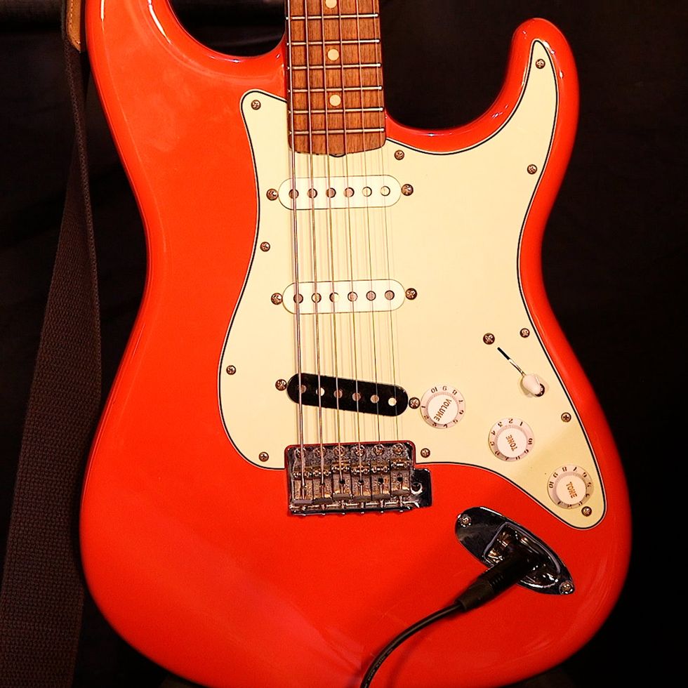 Bowen had a baritone neck matched with this Dacota red Fender Stratocaster body. It’s got stock pickups, which split the difference between the twang of a Strat and the bassy tones of the bari. This one is tuned to either B standard or drop A#.