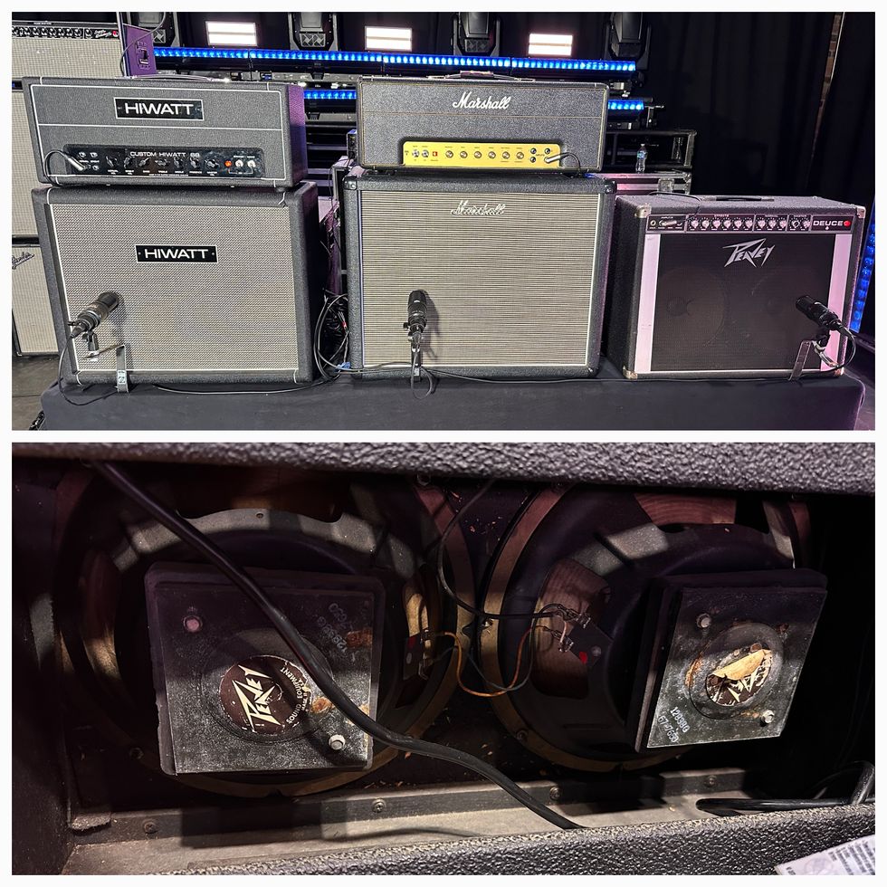This time around, like Bowen, Kiernan is running a trio of amps: a Hiwatt DR88, Marshall 1987x, and Peavey Deuce, which still has the original, square-magnet Peavey speakers. (A backup 2x12, loaded with Eminence Swamp Thangs, is on-hand in case things go wonky.) At this point, shouldn’t he just get a Kemper? “Nope,” he responds shortly.