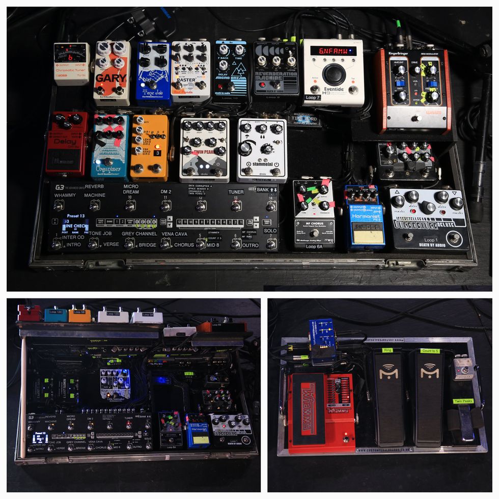 Kiernan’s board has many of the same stomps as last time, but it’s been configured into a double-decker layout rather than a sprawling, side-by-side affair, and the newest addition is the EarthQuaker Devices Gary, a distortion/fuzz combo he made with the Ohio effects company from the green side of their now-discontinued Gray Channel. Aside from his new buddy Gary, Kiernan runs a Boss TU-3S, EQD Tone Job, Red Panda Raster, Death By Audio Micro Dream and Reverberation Machine, Eventide H9 Harmonizer, Warm Audio Ringer Bringer, Boss DM-2w, EQD Organizer, Montreal Assembly Count to Five, Drolo Twin Peaks and Stamme[n], Death By Audio Interstellar Overdriver Deluxe, Boss PS-5, Moog MF Chorus, Xotic EP Booster, Intensive Care Audio Vena Cava Filter, EQD Data Corrupter, and GigRig Remote Loopy 2. A smaller separate board is home to a DigiTech Whammy, two Mission Engineering expression pedals, a third expression pedal for the Drolo Twin Peaks, and a Mission Engineering Expressionator.