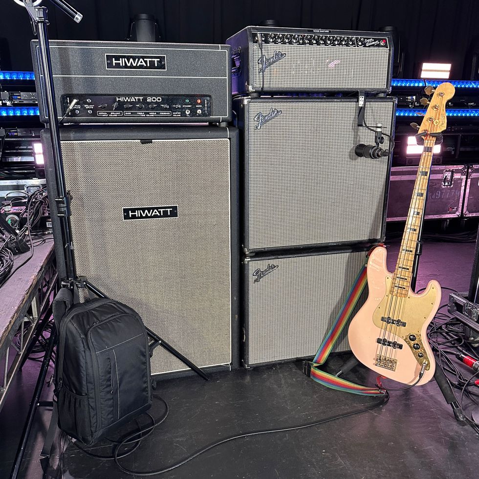 Taking a 33-percent-less approach than his bandmates on 6-string guitar, Devonshire runs just two amps: a Hiwatt DR201 and a Fender Super Bassman.