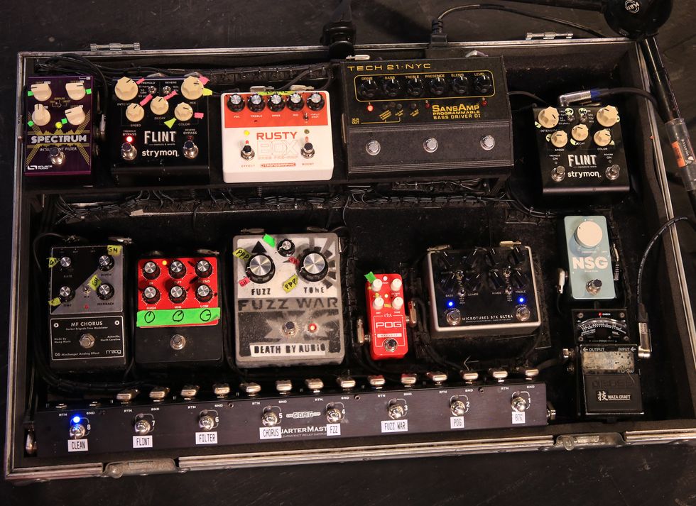 That said, these are the ones he feels are worth the risk: a Boss TU-3W, GigRig QuarterMaster, Darkglass Electronics NSG and Microtubes B7K Ultra, EHX Pico POG, Death By Audio Fuzz War, Baltimore Sonic Research Institute FZZ, Moog MF Chorus, Source Audio Spectrum, two Strymon Flints, Tronographic Rusty Box, and Tech 21 SansAmp Programmable Bass Driver DI.