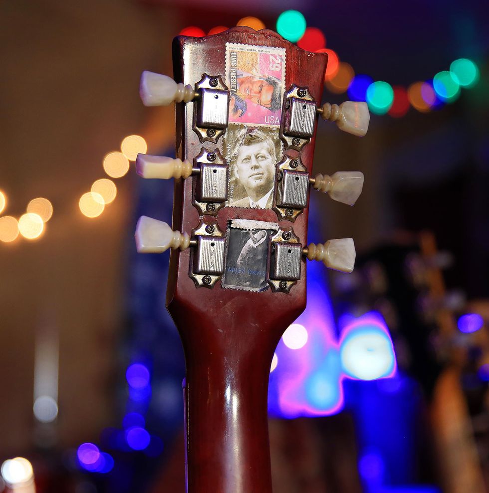 JD Simo’s No. 1 remains his beloved and battered 1962 Gibson ES-335. It’s had a few changes since his last Rundown. Note JFK on the back of its headstock! Nashville star luthier Joe Glaser modded the neck tone control to knock it out of phase. During quarantine, Simo reinstalled the original Bigsby bridge with nylon saddles. This, and all of Simo’s guitars, use Stringjoy strings (.010 sets, when tuned to standard) and are picked with Jim Dunlop tortoise mediums.