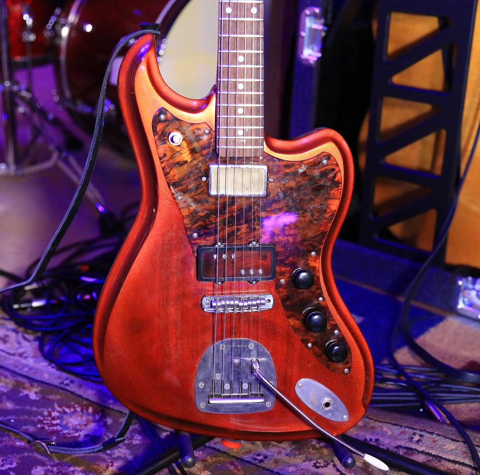 It began life as a mid-’60s Jazzmaster body. Fellow Nashville-based guitarist George Bradfute added a MusiKraft neck and refinished and rewired this 6-string with a humbucker and S-style pickups from Vintage Inspired Pickups, out of Beverly, Massachusetts. There is a phase switch on the tone control.