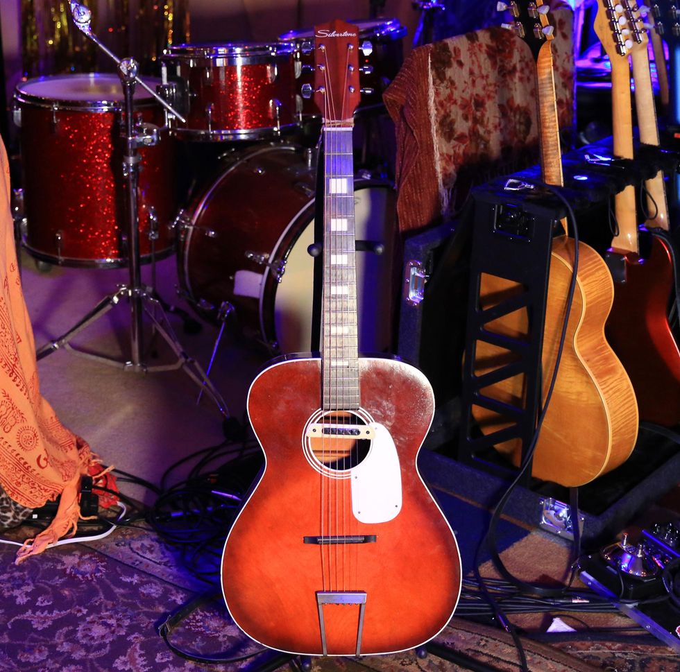 Simo’s going for heavy acoustic vibe with this 1965 Silvertone H165. It stays tuned down to C# and is amplified with a LR Baggs M80 pickup.
