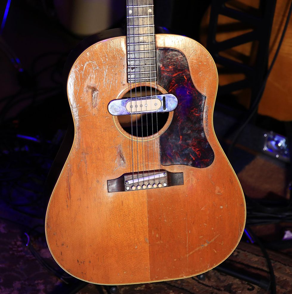 J-50 is the Gibson company’s designation for its natural-finish J-45 workhorses—the guitar that helped define modern folk music. This 1961 J-50 features a 1963 DeArmond RHC-B soundhole pickup and stays strung with nickel bronze .012–.056 strings.