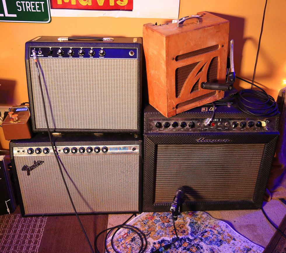 Depending on the scenario, Simo currently uses one, or a combination of, these amps: a 1964 Ampeg Gemini I with a Weber ceramic-magnet ferromax speaker, a 1949 Alamo Model 3 (lower right), a 1972 Fender silver-panel Deluxe Reverb converted to black-panel specs (also with a Weber speaker), and a Pre CBS Amps Clifford 18W made by Zack Allen of Nashville’s Carter Guitars. The latter is essentially a 7591-output-tube Princeton Reverb clone and has a Weber speaker. Simo runs with his amps with an AmpRX Brown Box power attenuator.