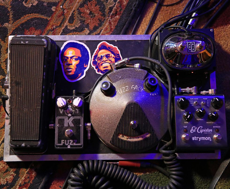 Simo’s very simple pedalboard includes a 1972 Dallas Arbiter Fuzz Face, a 1973 Vox Cry Baby with a Chase tone pot, a rehoused vintage Kay fuzz, a Strymon El Capistan, and a Fender trem/reverb Switch. XAct Tone Solutions made the board and its battery box. Simo also uses Divine Noise Cables.