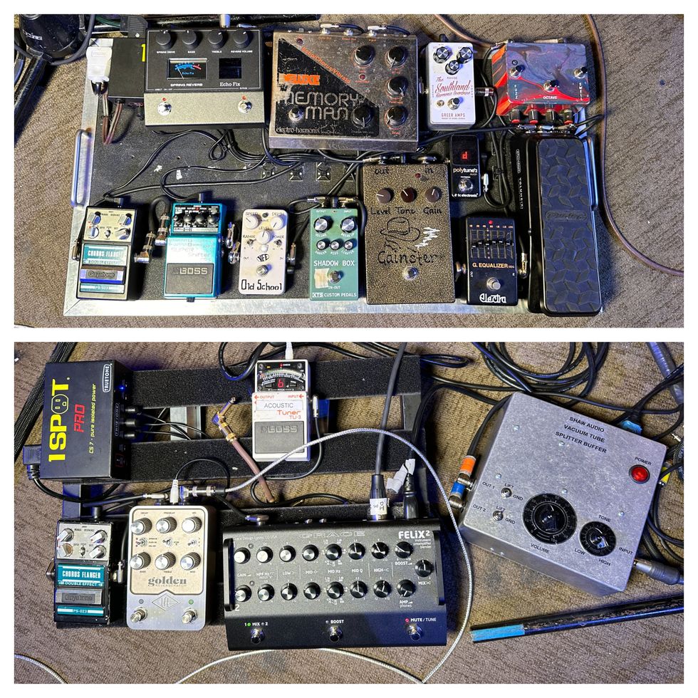 Hughes runs a larger board for his electric and a smaller one for his acoustic guitars. The electric board includes a Prescription Electronics Experience, Clark Gainster, a prototype XTS Shadow Box, Greer Southland, Dunlop volume pedal (with tuner out), VFE Old School tremolo, Boss PS-5 Super Shifter, Guyatone PS-023, EHX Deluxe Memory Man, Echo Fix EF-P2 Spring Reverb, and finally a Shaw Audio Vacuum Tube Splitter Buffer, which splits two mono lines to the amps.