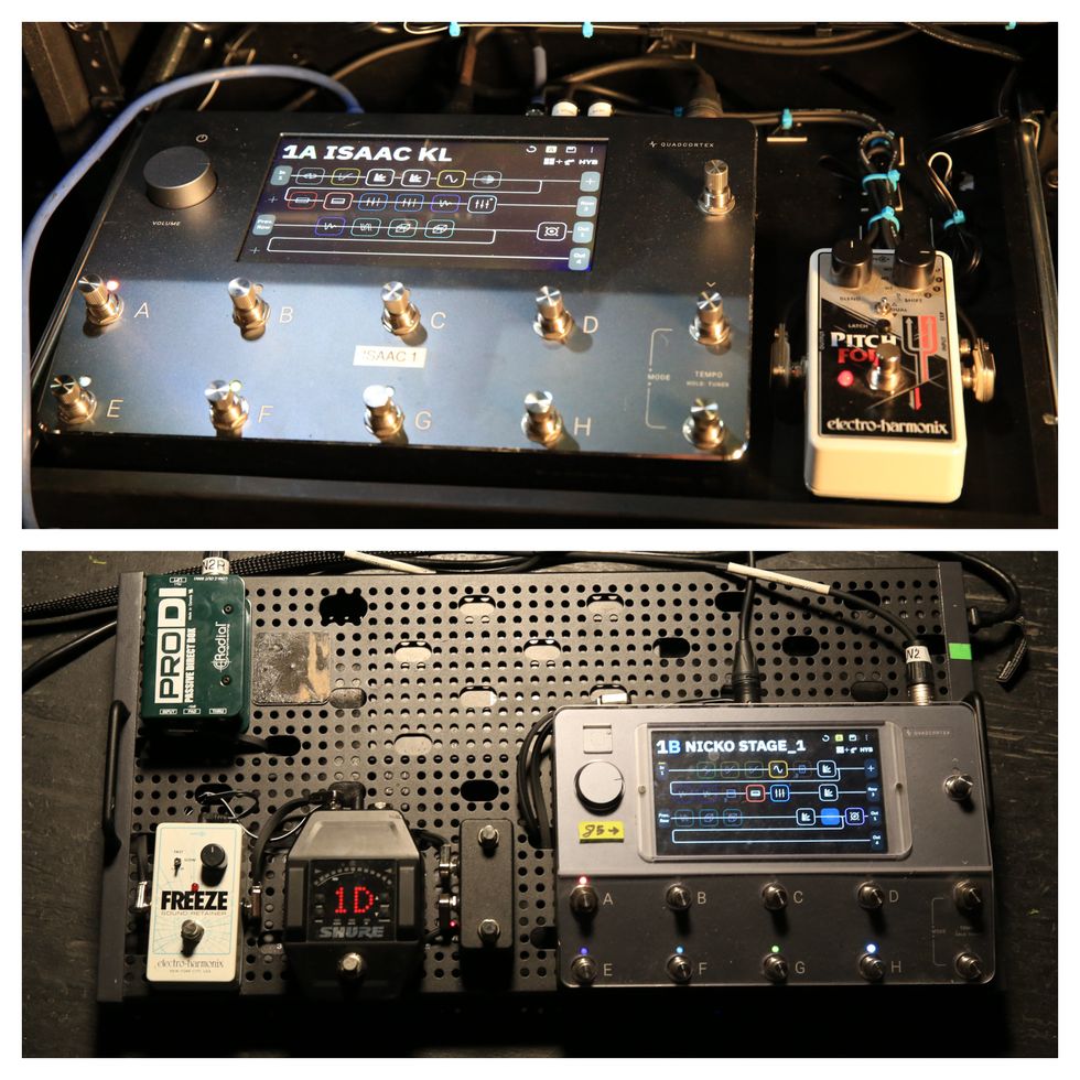 Both guitarists have downsized to the Neural DSP Quad Cortex, and they have a pair of mirrored setups for both on and offstage. Hale and Calderon are both modeling 5150 III heads, but Calderon is going with the EL34 flavoring for a slightly different sonic distinction. Core sounds are built off the 5150 IIIs and other ingredients sprinkled in throughout the set include some slight chorus, heavily modulated “evil chorus” with an added semitone above the base sound, and an Electro-Harmonix (in the rack) that provides a layered octave sound for pure chaos. The EHX Freeze pedal onstage is put in place so they can hold a note and tune underneath it. They roam the stage untethered thanks to the Shure GLXD16+ digital wireless guitar pedal system.