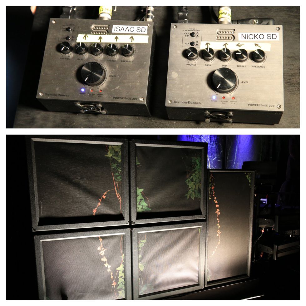 The two Quad Cortex units work with Seymour Duncan PowerStage 200 amps to hit Orange PPC412-C cabs onstage that are loaded with Celestion Vintage 30 speakers.