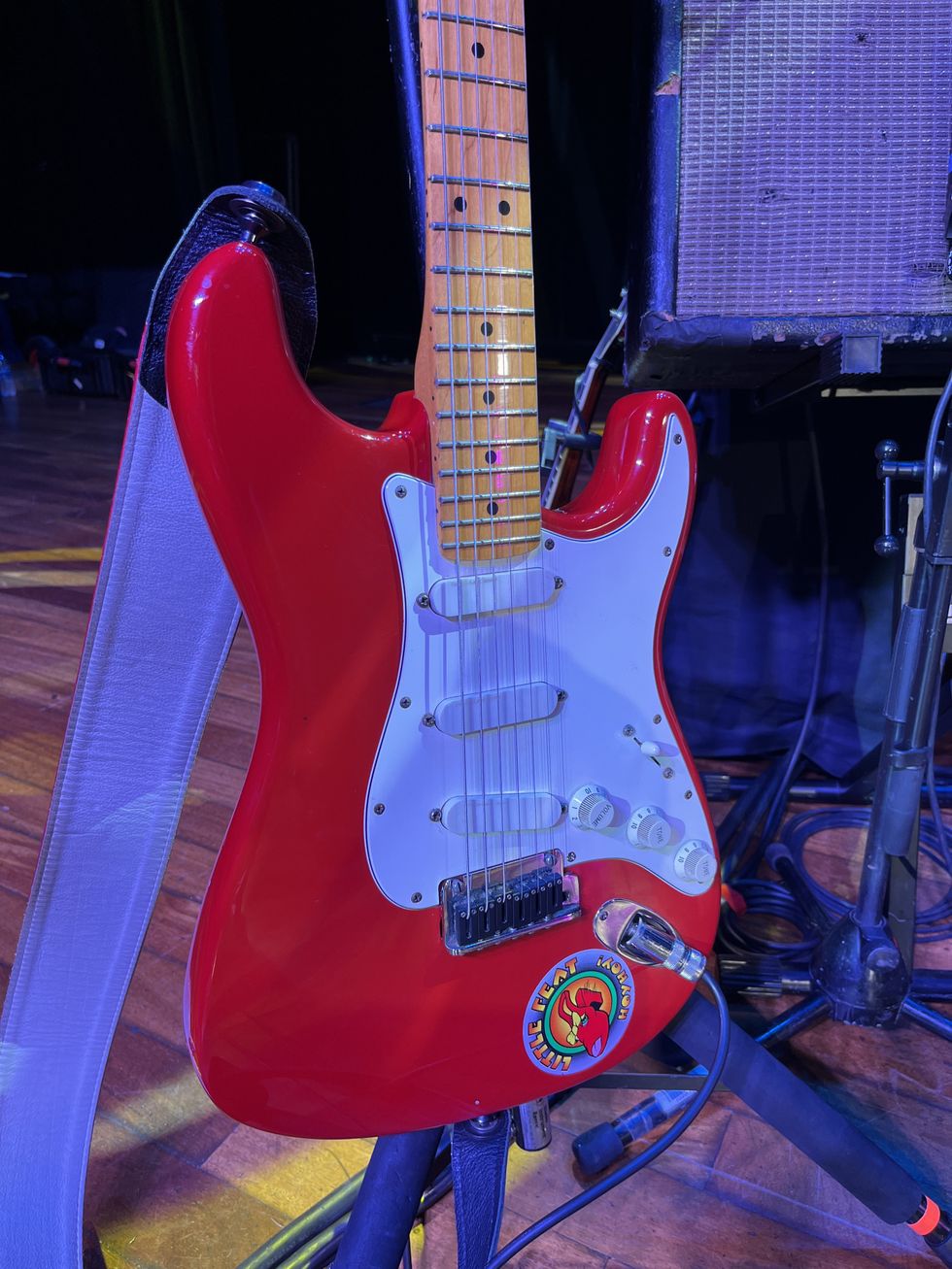 Tackett’s maple neck 1984 Red Strat Ultra is set up higher for slide.