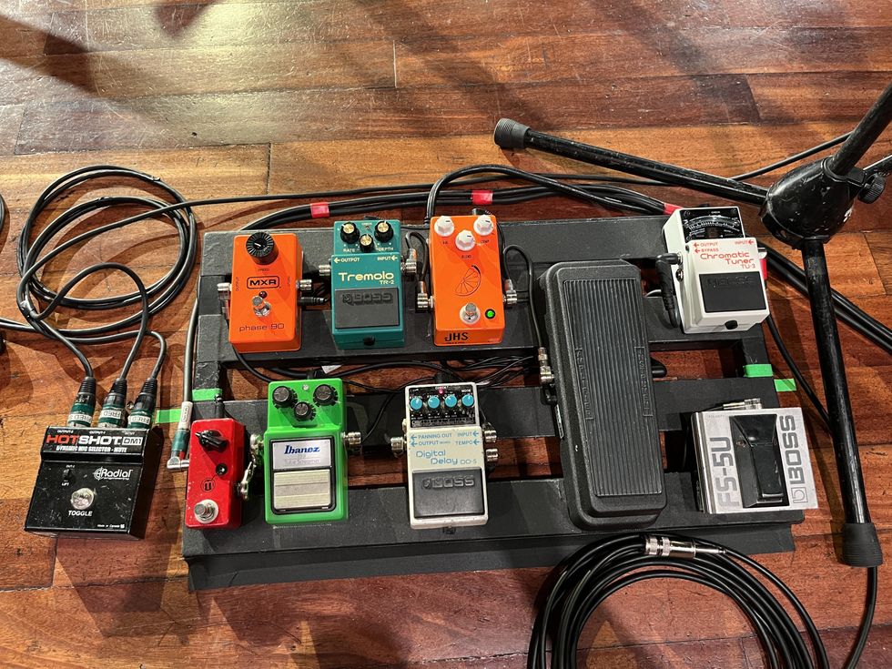Tackett’s pedal board features a Boss TU-2 Tuner, Dunlop Cry Baby, JHS Pulp ’N Peel V3, Boss Tremolo TR-2, MXR Phase 90, Boss DD-5 Delay with Boss FS-5U tap, Ibanez TS9, and a tiny mystery M boost.
